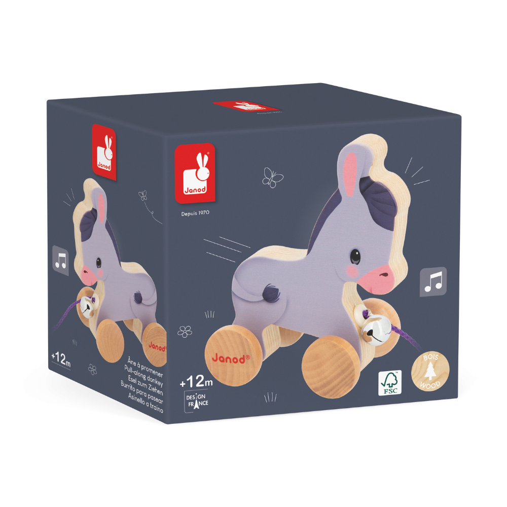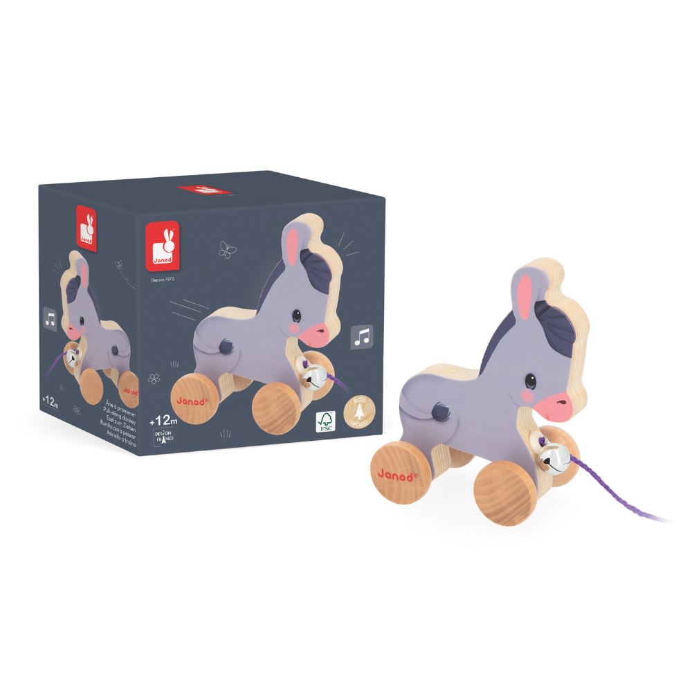 Na frente, há um sino. Quando o burrinho anda, ele faz som. Assim, a brincadeira fica mais divertida. Além disso, chama a atenção do bebê.