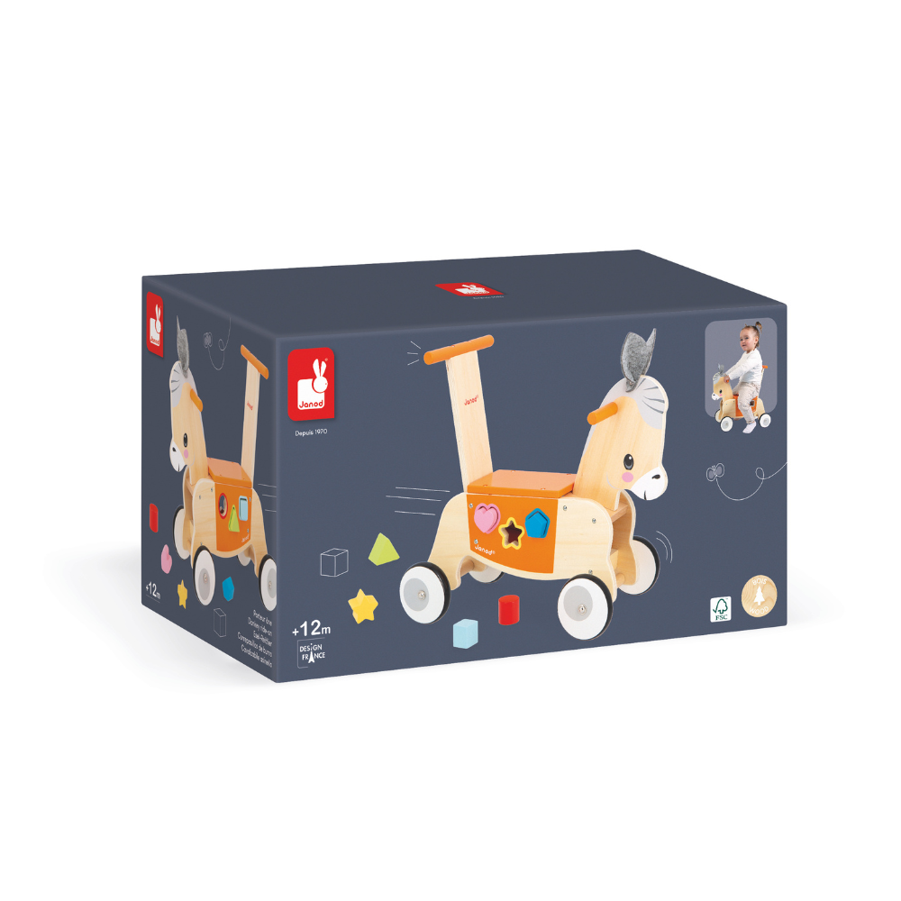O burrinho está super animado para descobrir o mundo, e o bebê também! Com este burrinho de madeira para montar, ele parte para novas aventuras a partir dos 12 meses de idade. Vamos lá! Ao brincar com o brinquedo, o bebê desenvolve o senso de equilíbrio e a coordenação motora ampla, tudo isso enquanto explora o ambiente ao redor. Quer empurrar o brinquedo ou ser empurrado? É possível graças à alça nas costas! Não importa como seu pequeno use o brinquedo, ele aprenderá a controlar o próprio peso e se divertirá muito. A melhor parte deste brinquedo educativo? O classificador de formas incluso, com 6 formas para encaixar nos compartimentos e retirar pela frente, para que você possa começar tudo de novo. Perfeito para desenvolver a destreza! Por fim, as 4 rodas de borracha são silenciosas e oferecem bom suporte para passeios tranquilos. Ideal para estimular a coordenação motora ampla e fortalecer o equilíbrio para andar, este burrinho de madeira para montar é simplesmente irresistível com suas orelhinhas de feltro e cores suaves. Seja para quem ama animais de fazenda ou simplesmente para quem gosta de dar os primeiros passos, ele ficará encantado!