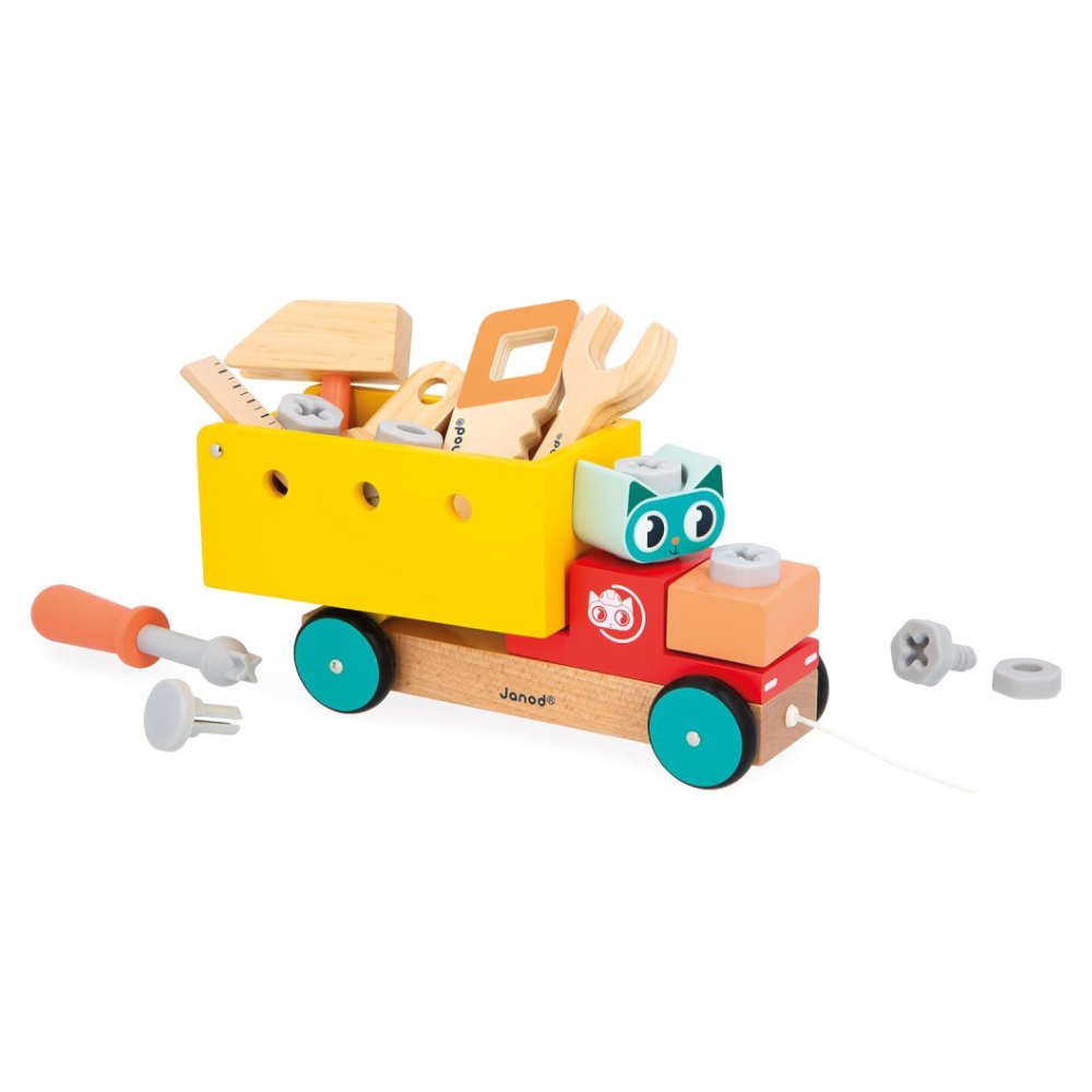 O caminhão é de madeira. Além disso, tem rodas com borracha. Por isso, o movimento é silencioso.