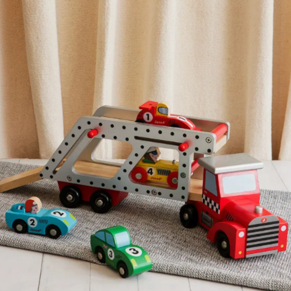 Com sua rampa de fácil manuseio, este caminhão de madeira pode acomodar dois carros de corrida em cada nível, ou seja, 4 carros no total (1 Formula 1 vermelho, 1 Speed azul, 1 Roadster verde e 1 Retromotor amarelo) para serem transportados no caminhão ou brincados separadamente. Para fazer a rampa deslizar para trás do caminhão e a porta abrir, basta puxar as alças vermelhas pequenas. Este incrível caminhão irá encantar todos os entusiastas de veículos com 2 anos de idade ou mais, com uma imaginação vívida!