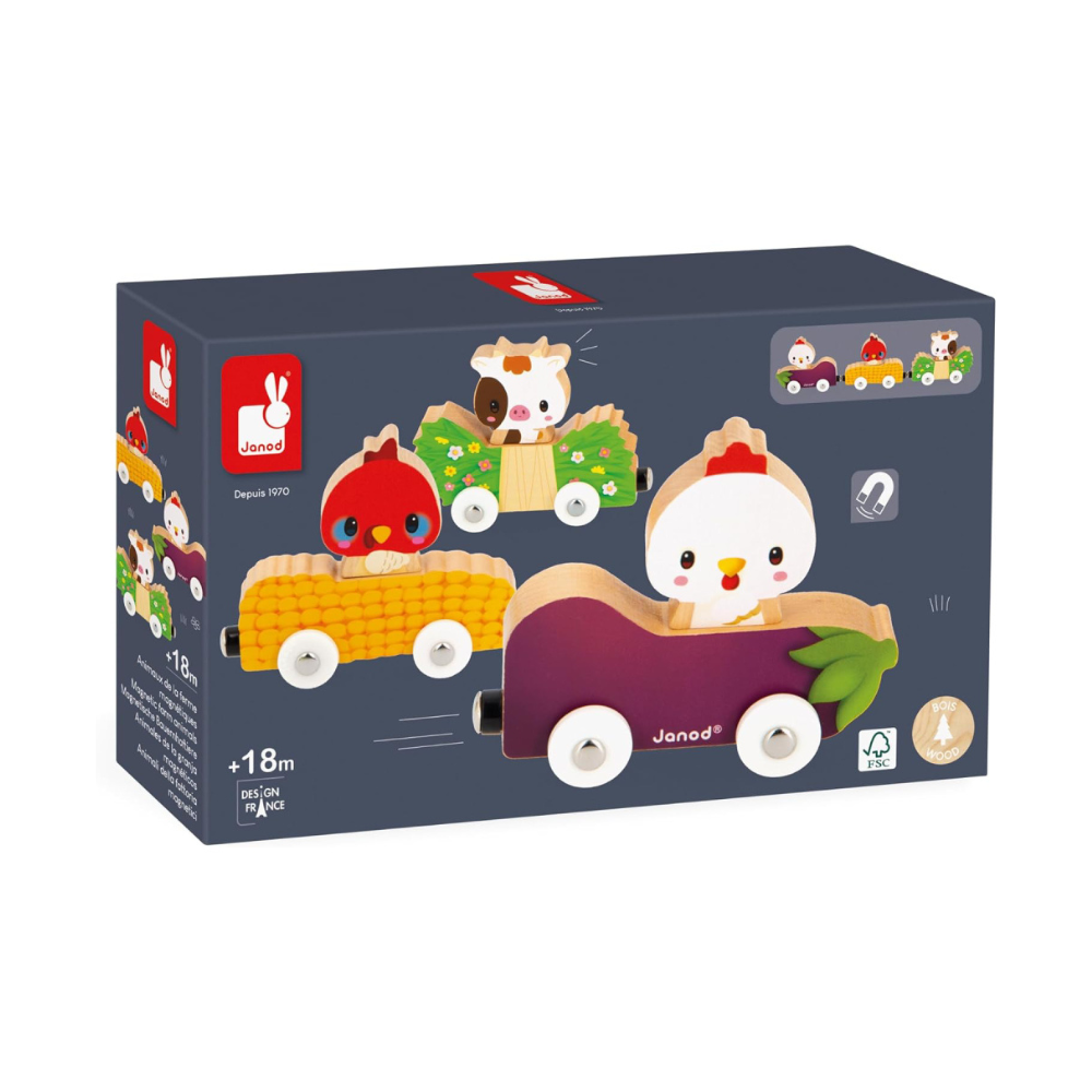Corrida na fazenda com carrinhos e animais magnéticos! Estimula coordenação, lógica e imaginação. Peças intercambiáveis formam trenzinho para mais diversão.