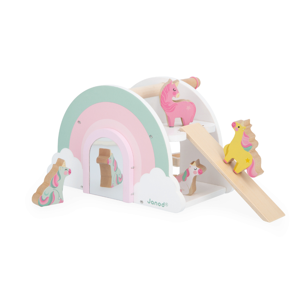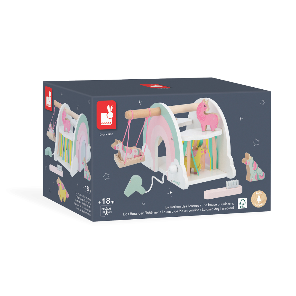 Casinha dos Unicórnios com 4 personagens e acessórios. Estimula imaginação e coordenação. Brinquedo educativo em madeira para crianças de +18 meses.