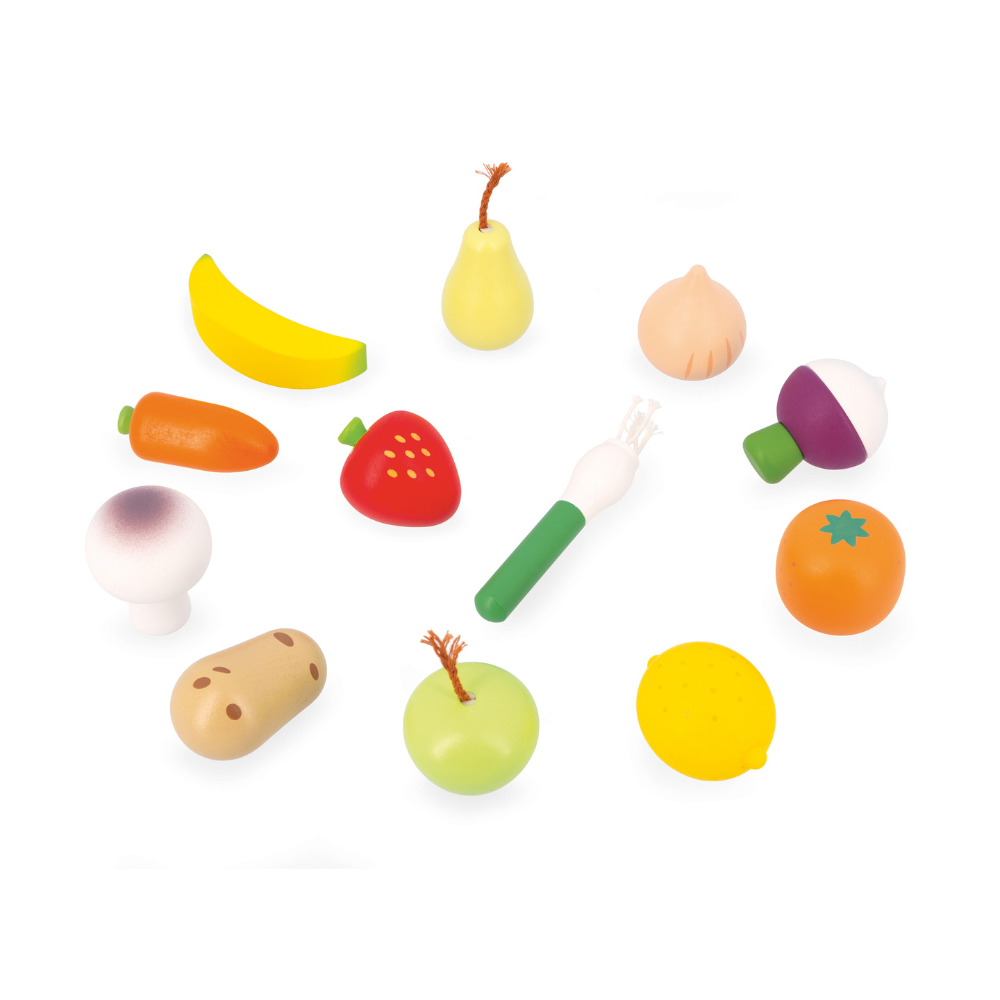 Kit frutas e verduras com 12 peças. Estimula imaginação e vocabulário. Brinquedo de madeira para crianças de +3 anos para cozinha e mercadinho.