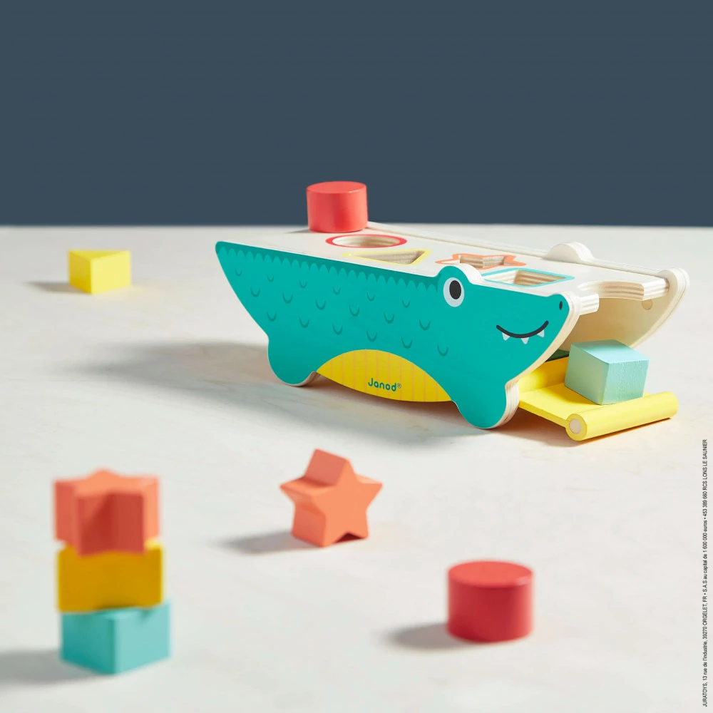 Encaixa formas crocodilo com 8 peças. Estimula coordenação, cores e formas. Brinquedo educativo +12 meses com abertura magnética.