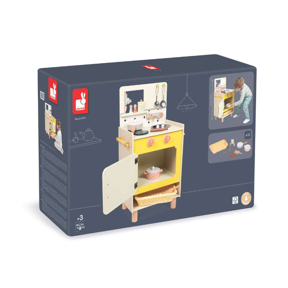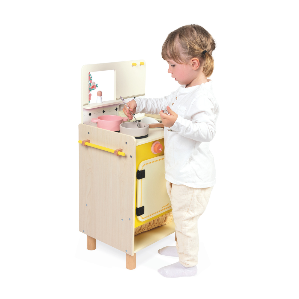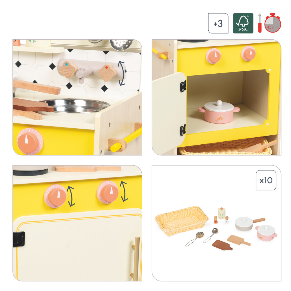 Fogão de madeira com 11 acessórios. Estimula imaginação e faz de conta. Brinquedo indicado para crianças de +3 anos, compacto com forno, pia e utensílios.