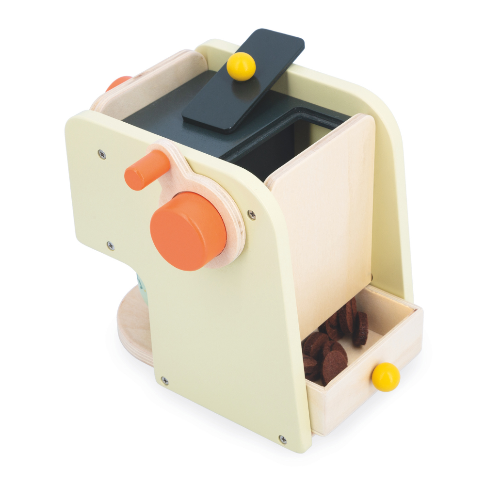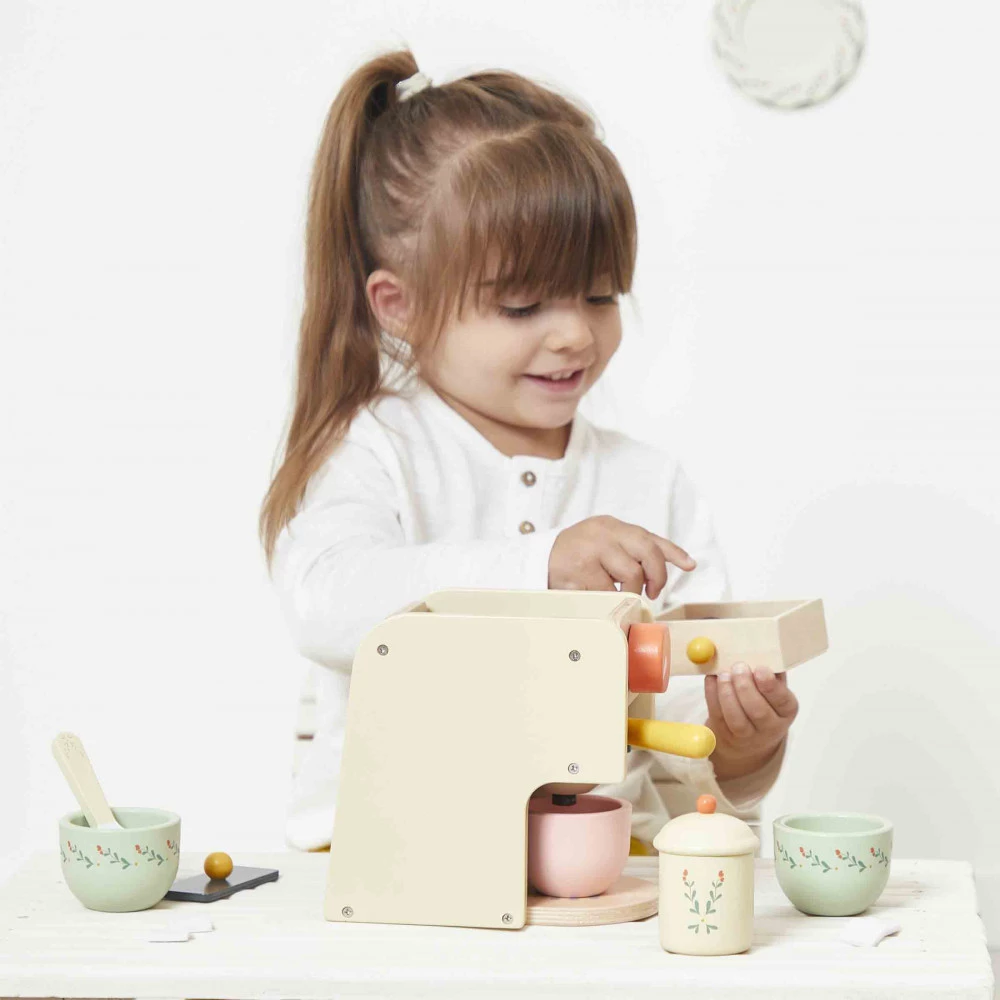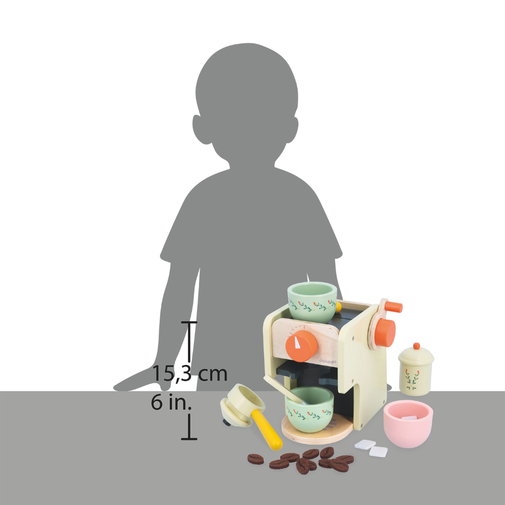 O kit traz uma máquina de café. Também vem com 5 acessórios. Assim, a criança vira uma pequena barista.