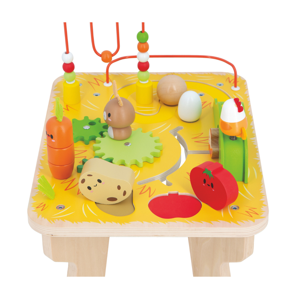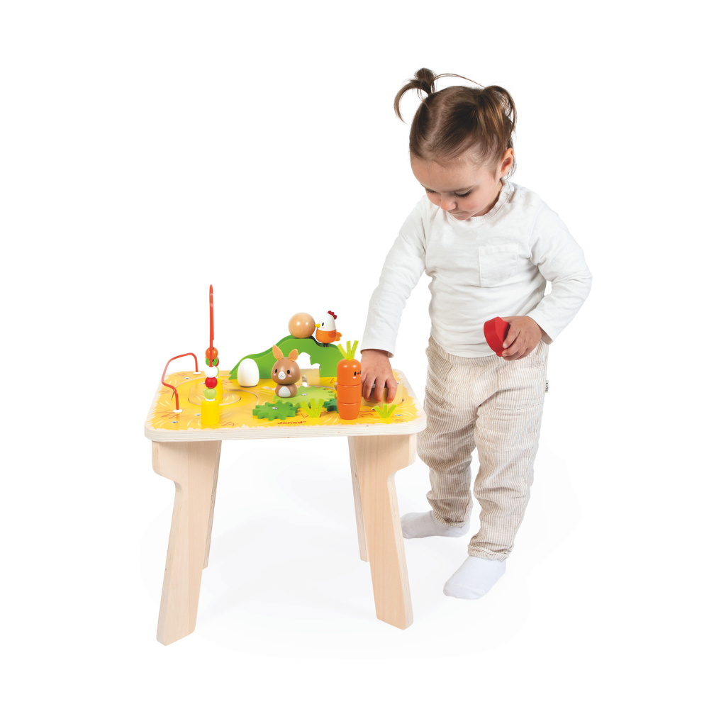 A mesa traz 7 atividades. Assim, a criança explora sem parar. Primeiro, há uma pista com bola. O pintinho empurra e a bola desce.