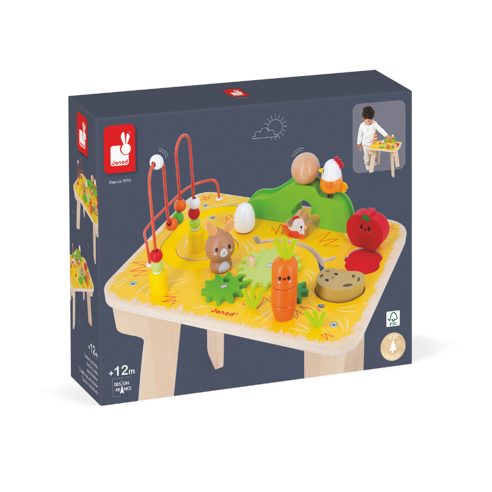 Rumo à fazenda. Esta mesa de atividades encanta. É indicada a partir de 12 meses. Além disso, reúne várias brincadeiras.